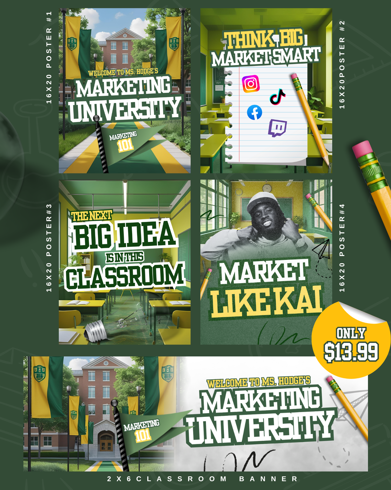 This classroom decor set features four 16x20 posters ready for printing at Walgreens, with same-day pickup available in many locations. It also includes a 2x6 classroom banner. All templates are customizable through Canva, allowing you to add your name and make your classroom truly your own!